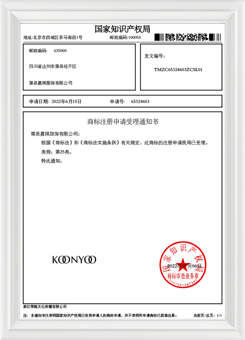 Свидетельство о регистрации товарного знака KOONYOO класса 25